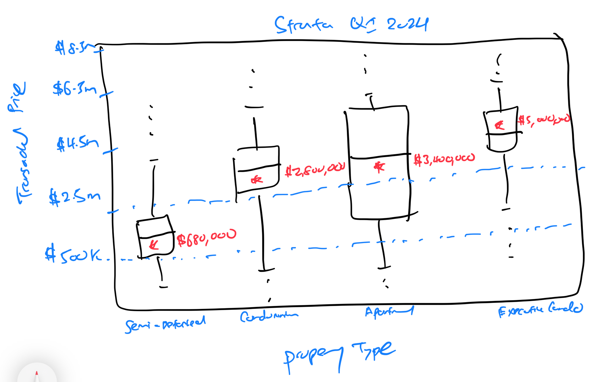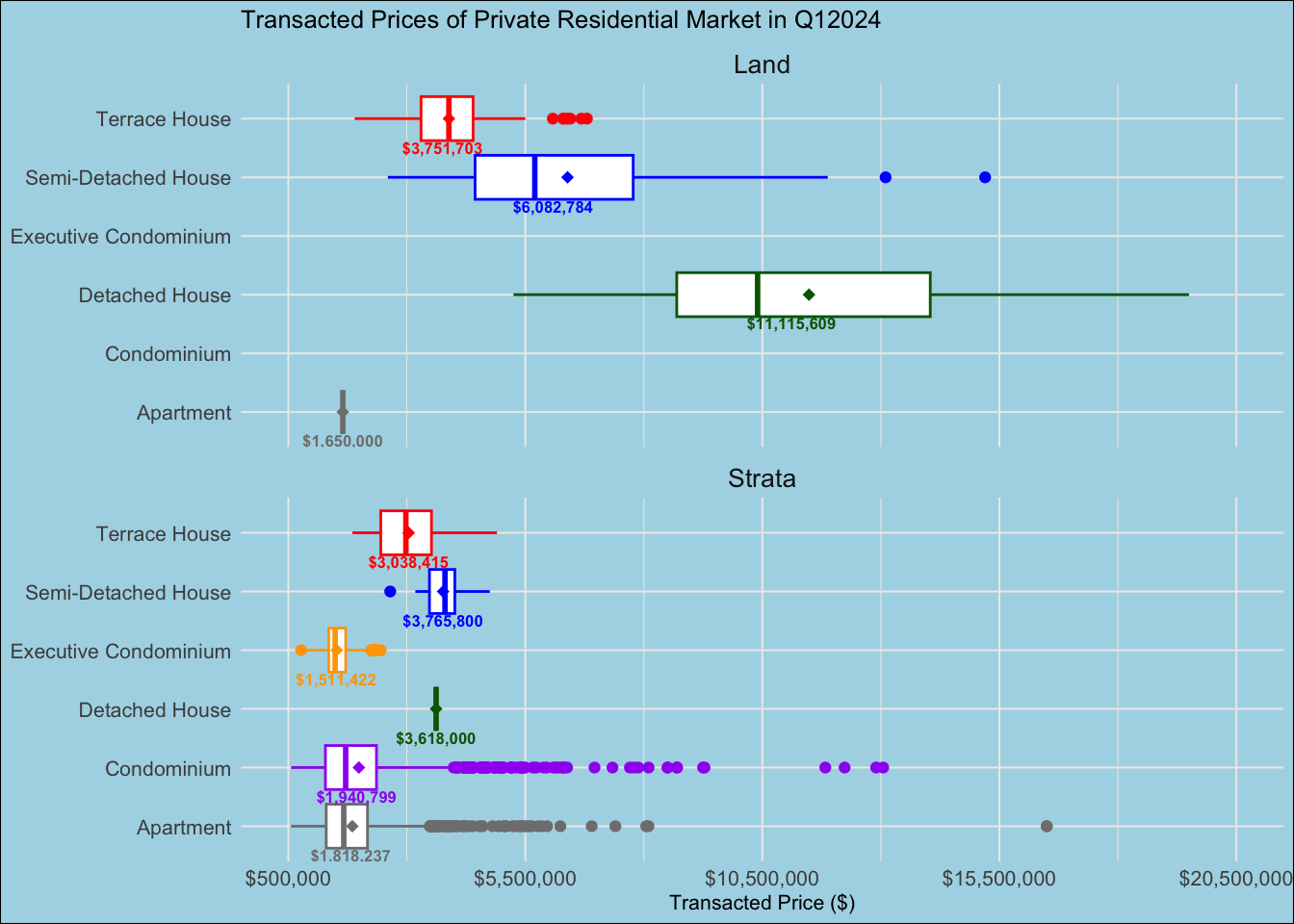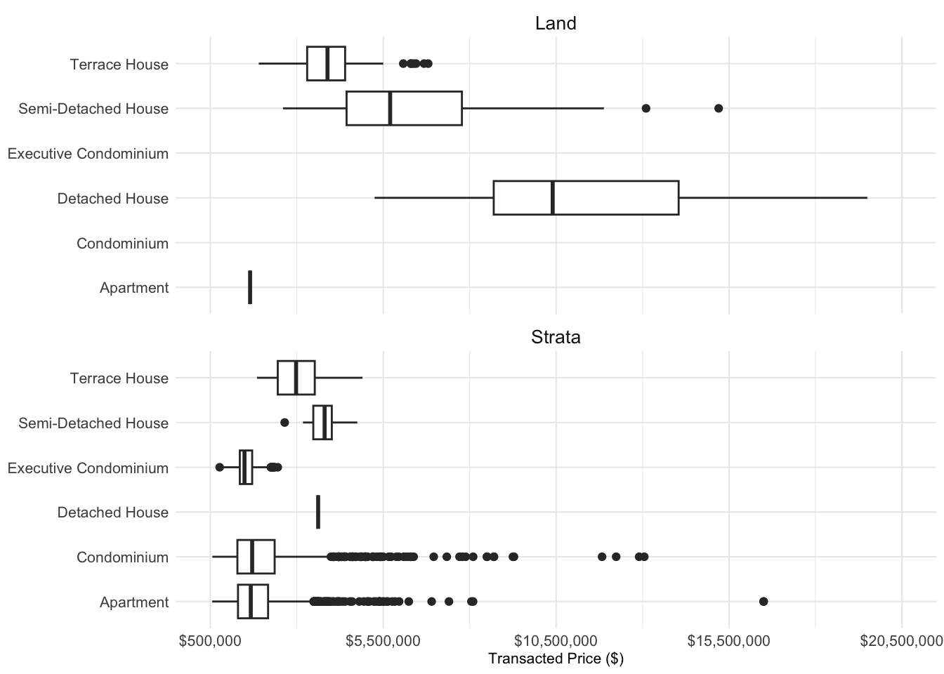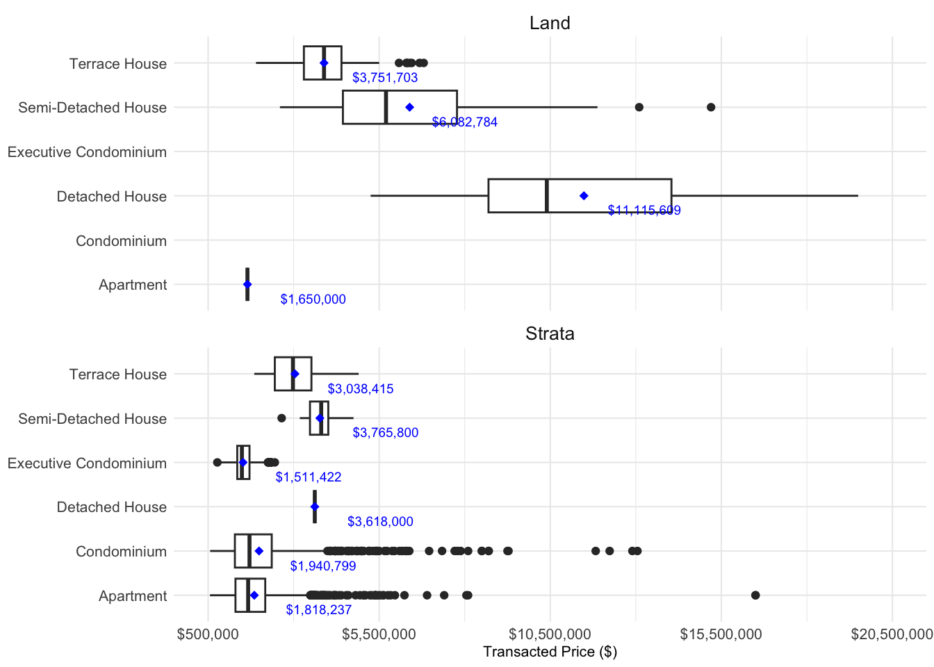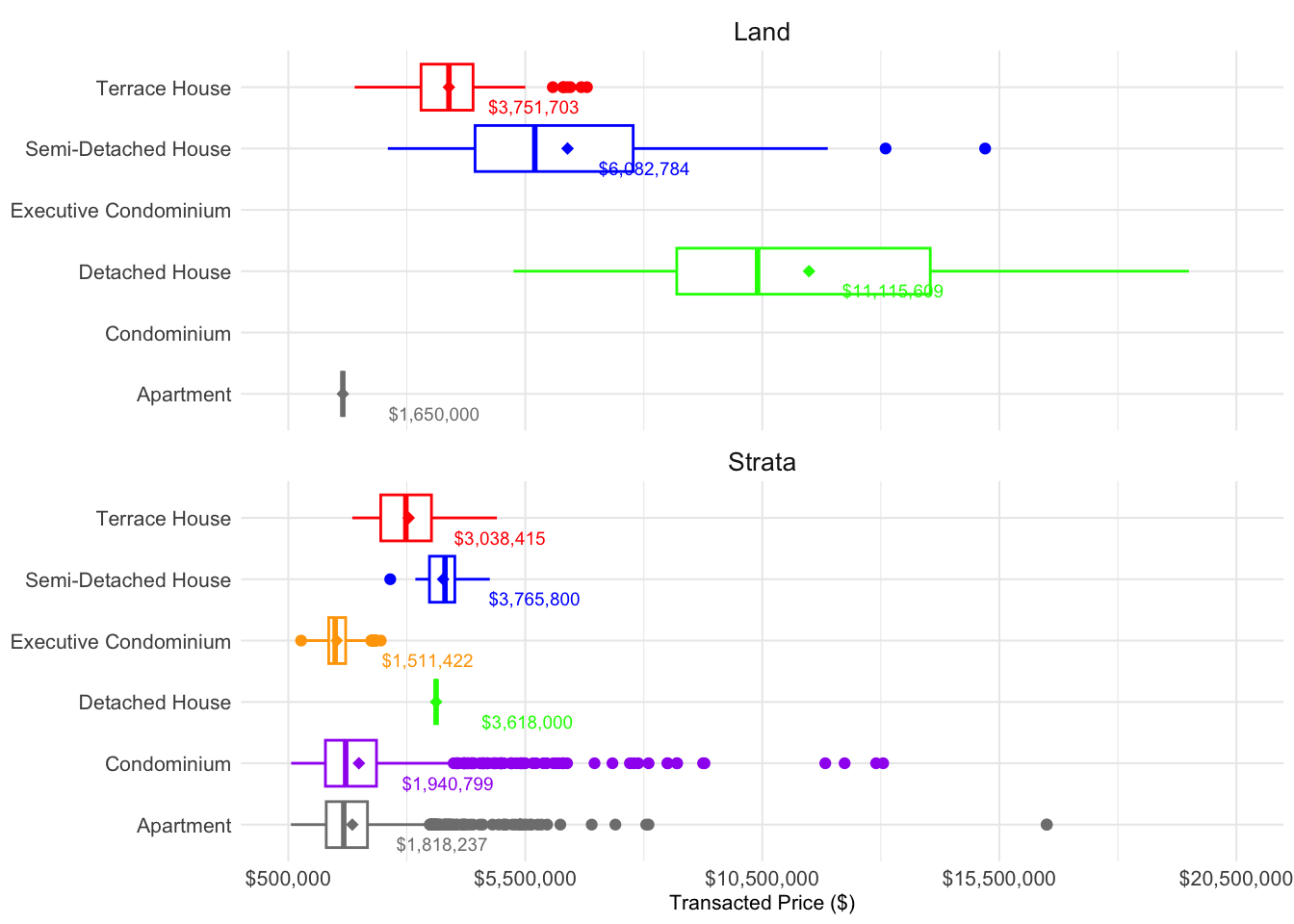 b\. The numbers of the average transacted price labelled within each box and whisper plot were small and some of the numbers were cut out such as Apartment in both Land and Strata.