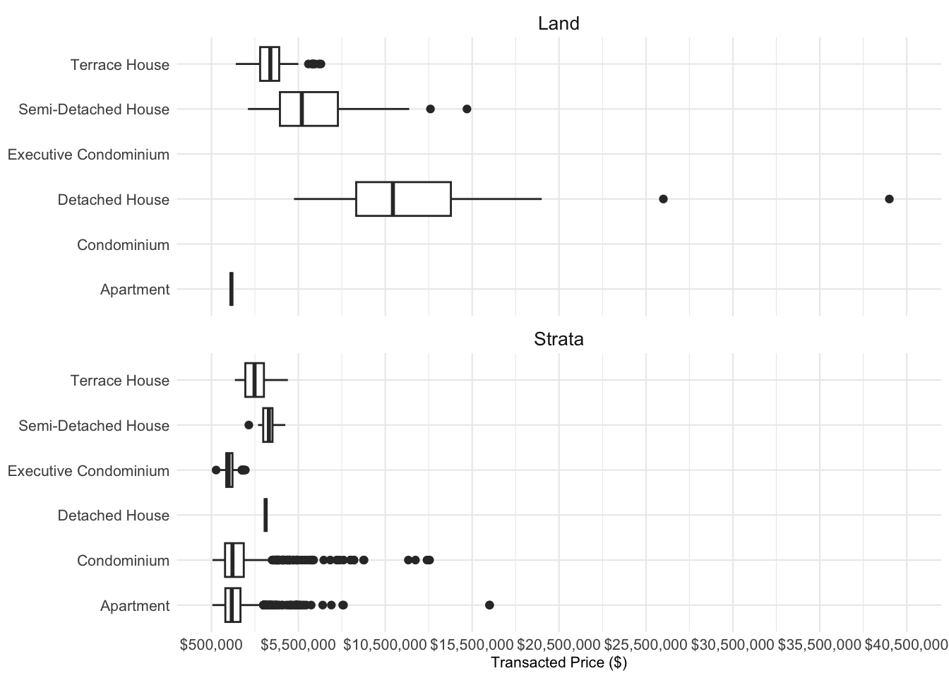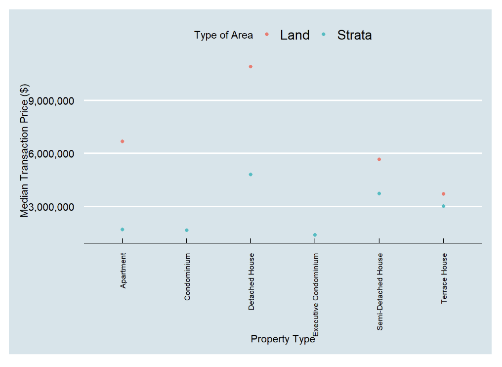 By limiting the x axis to $20,500,000, the two outlier transactions were removed. At a first glance, it is clear that there are no transactions of Executive Condomimium and Condominium within the Strata type. Additionally, there is only one transaction for ‘Apartment’ in Land and ‘Detached House’ in Strta.